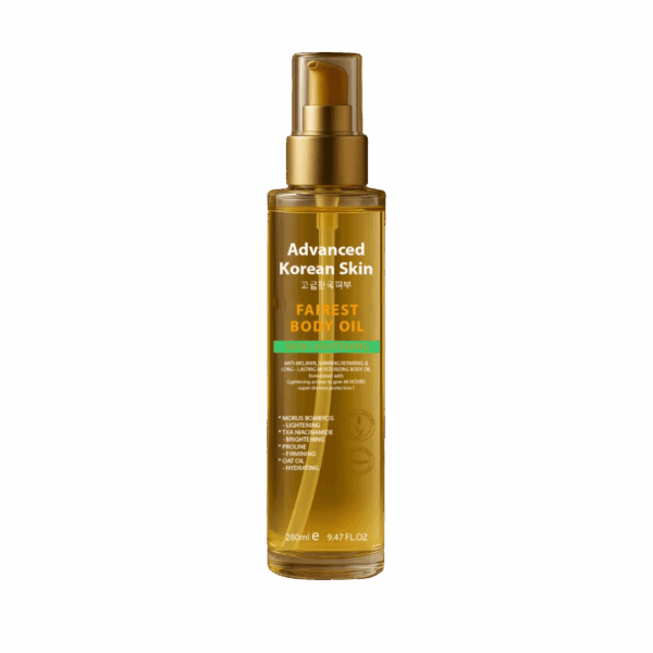 Advanced Korean Skin Fairest Body Oil is a lightweight, fast-absorbing body oil designed to nourish skin and enhance radiance while leaving no heavy, greasy residue.